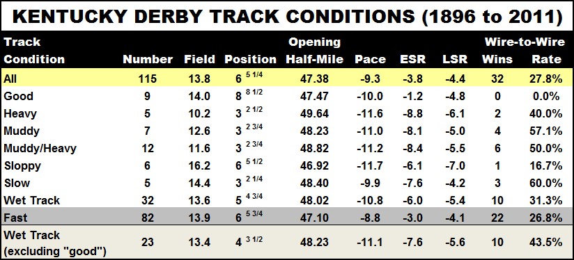Second, it looks like the track will be sloppy or even muddy by race time. How does this change the complexion of the race? Take a look at the following chart: