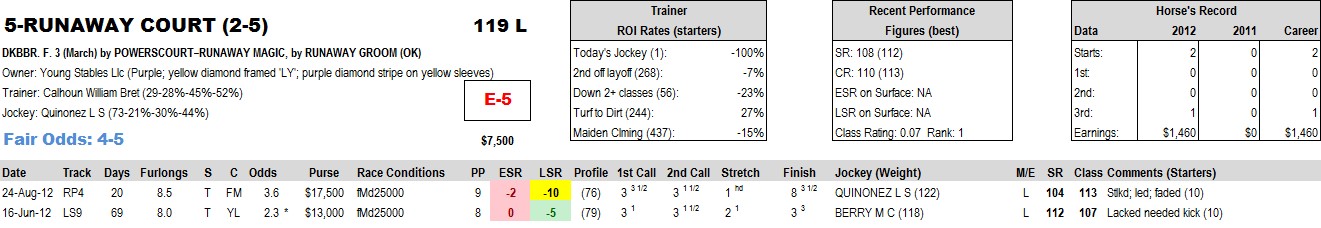 Holdin Bullets shows just the opposite — a ridiculously fast ESR (-17), a horrible LSR (-22) and a negative Pace Profile (-78 degrees) in his last race.